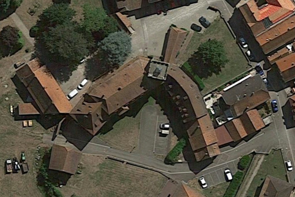 les services sociaux. Donjon en moellons de grès avec chaînes d'angle à