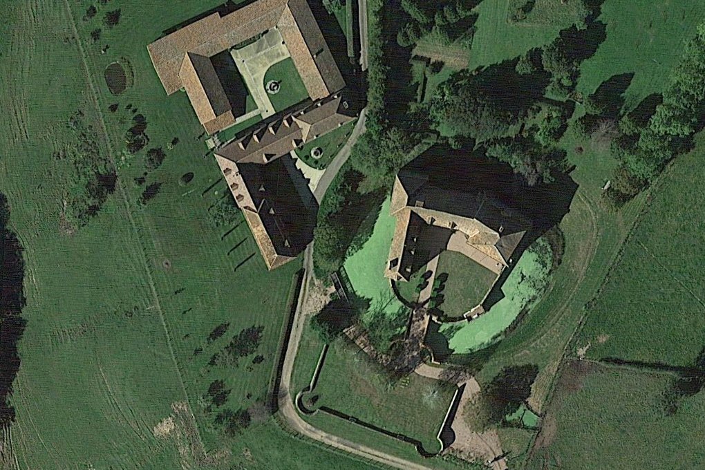 bâtiments en U sur une plate-forme rectangulaire, entouré de fossés en eau,