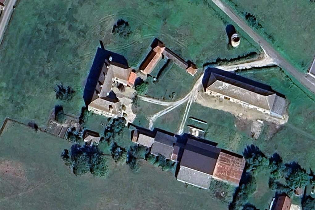 qu'encadrent deux grands bâtiments rectangulaires, le colombier est isolé au